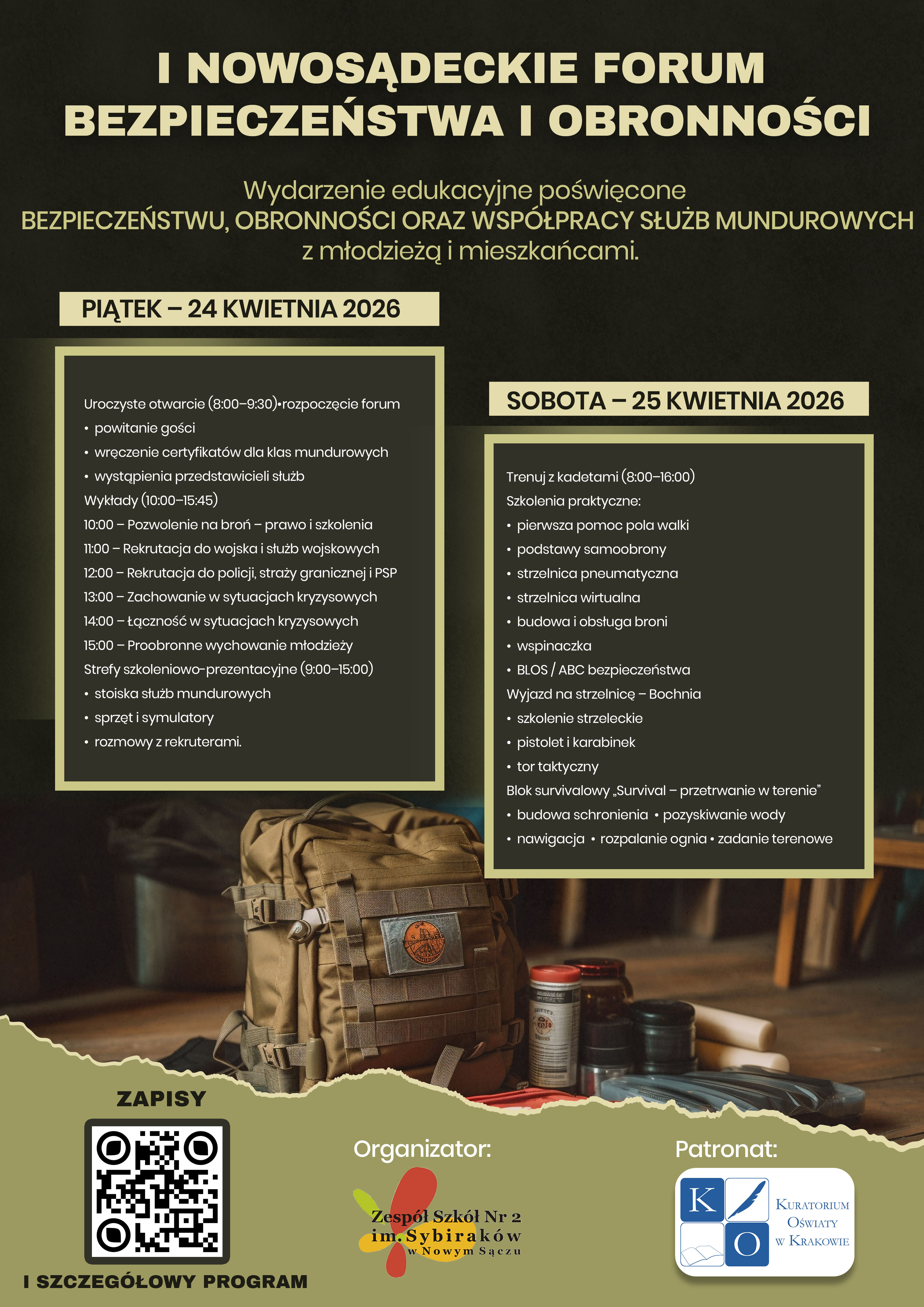 I Nowosądeckie Forum Bezpieczeństwa i Obronności stanowi platformę współpracy między szkołami, służbami mundurowymi, instytucjami państwowymi oraz organizacjami społecznymi. Wydarzenie ma na celu: