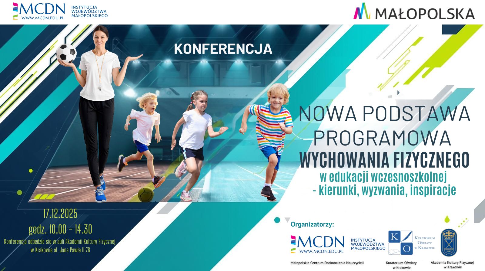 Kuratorium Oświaty w Krakowie, Małopolskie Centrum Doskonalenia Nauczycieli w Krakowie oraz Akademia Kultury Fizycznej w Krakowie zapraszają nauczycieli edukacji wczesnoszkolnej na konferencję metodyczną poświęconą praktycznym aspektom realizacji nowej podstawy programowej wychowania fizycznego w klasach I–III.