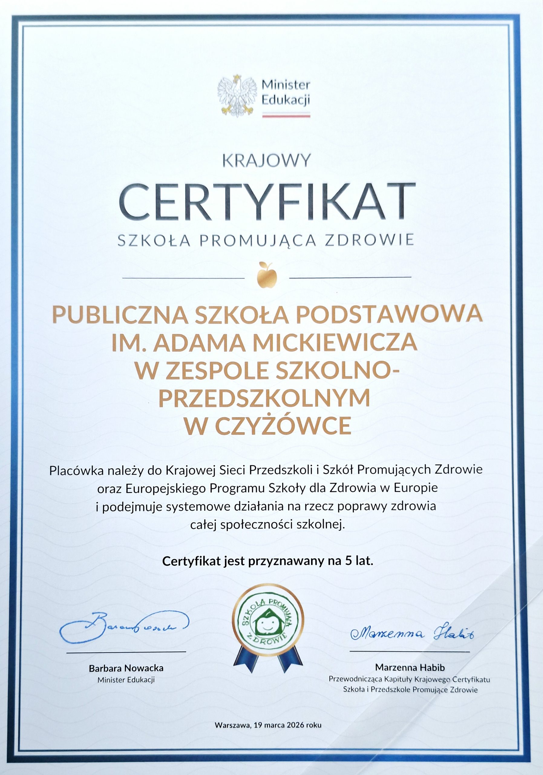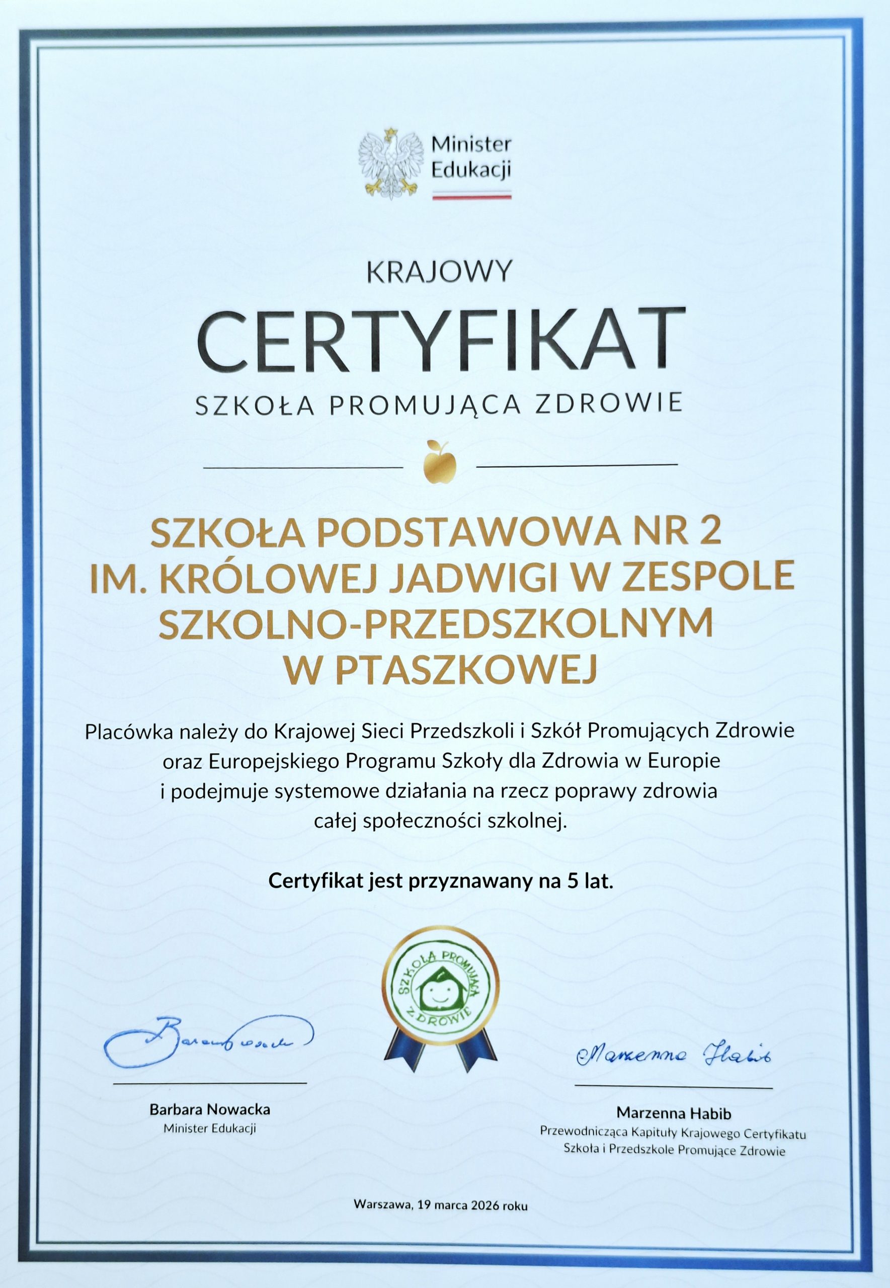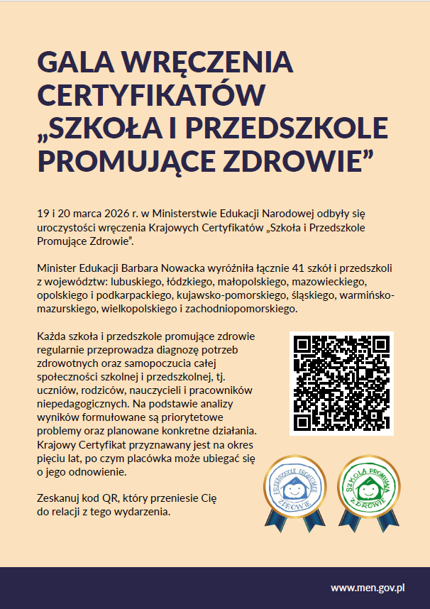 Uroczysta Gala wręczenia Krajowych Certyfikatów „Przedszkola Promującego Zdrowie” i „Szkoły Promującej Zdrowie” odbyła się w siedzibie Ministerstwa Edukacji Narodowej w Warszawie 19 marca 2026 r.