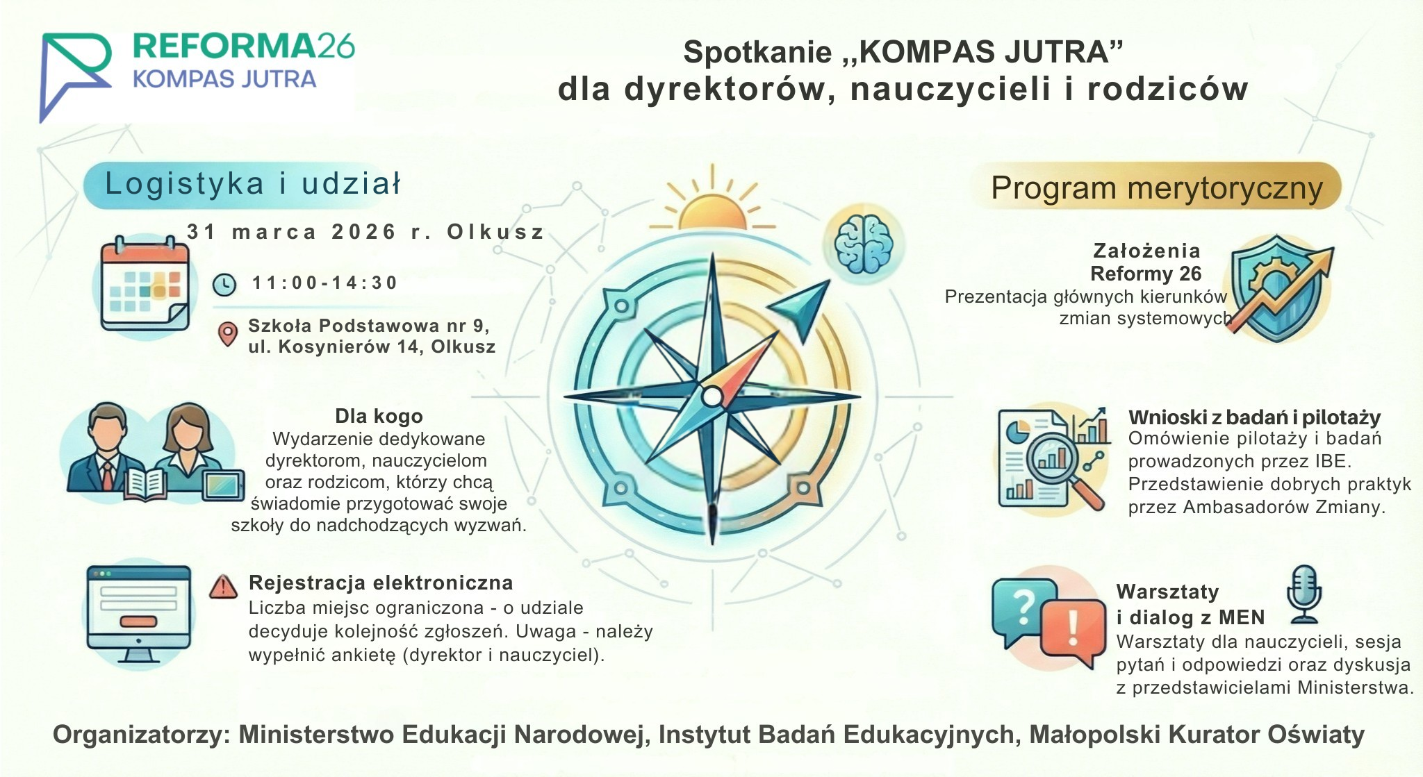 Małopolski Kurator Oświaty zaprasza dyrektorów i nauczycieli szkół podstawowych oraz przedstawicieli rodziców uczniów do wzięcia udziału w spotkaniu organizowanym przez Ministerstwo Edukacji Narodowej, Instytut Badań Edukacyjnych oraz Kuratorium Oświaty w Krakowie w ramach trasy „Kierunek: Kompas Jutra”.