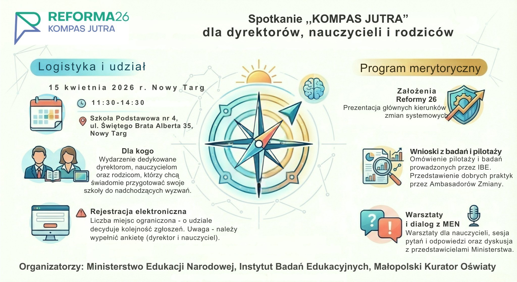 Małopolski Kurator Oświaty zaprasza dyrektorów i nauczycieli szkół podstawowych oraz przedstawicieli rodziców uczniów do wzięcia udziału w spotkaniu organizowanym przez Ministerstwo Edukacji Narodowej, Instytut Badań Edukacyjnych oraz Kuratorium Oświaty w Krakowie w ramach trasy „Kierunek: Kompas Jutra”.